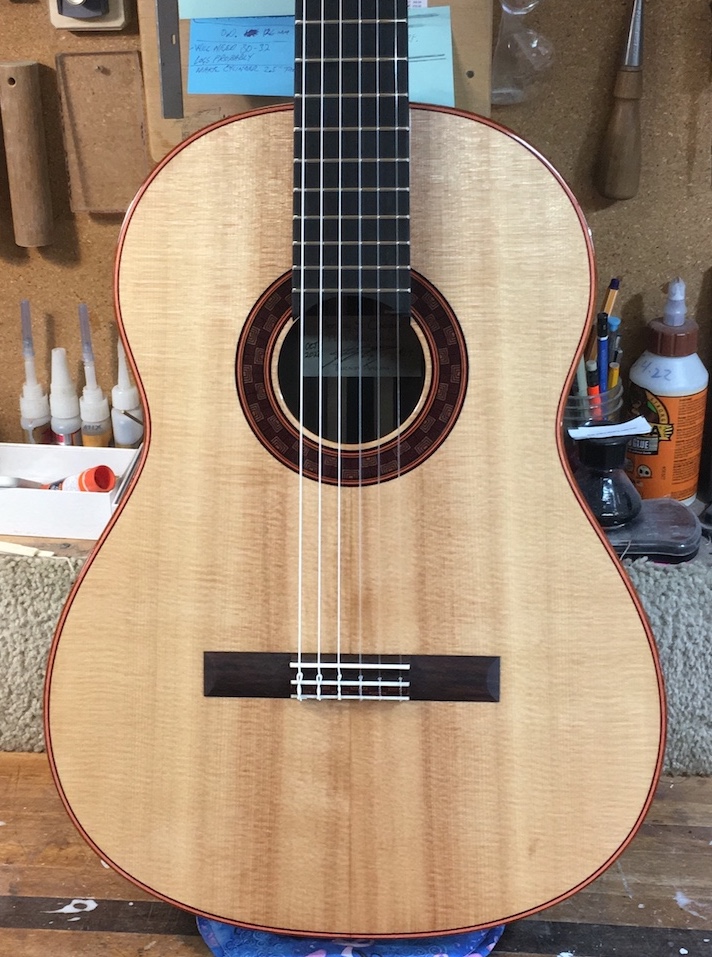 “In 2019 Jeremy Cooper made for me a 640mm scale Brazilian model double-top with Spruce outside, balsa middle, and cedar inside. He delivered exactly the instrument I wanted, and it continues to be one of my favorite and most-played guitars. It has a very easy action with a strong yet sweet sound using normal tension nylon strings, and has a broad color palette unlike many double-top guitars. I highly recommend Jeremy’s instruments!”
